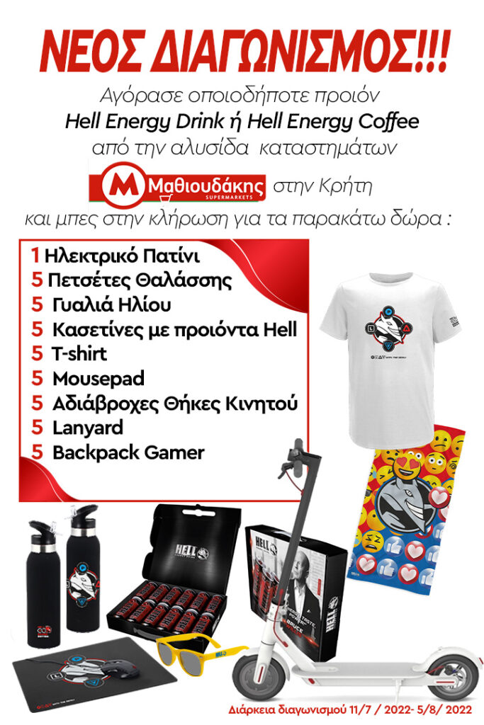 Συμπληρώστε την παρακάτω φόρμα συμμετοχής για να λάβετε μέρος στην κλήρωση που διεξάγετε από τα καταστήματα Μαθιουδάκης και την Hell Energy Drink. Όσα τεμάχια αγοράσετε τόσες συμμετοχές λαμβάνετε στην κλήρωση!!!